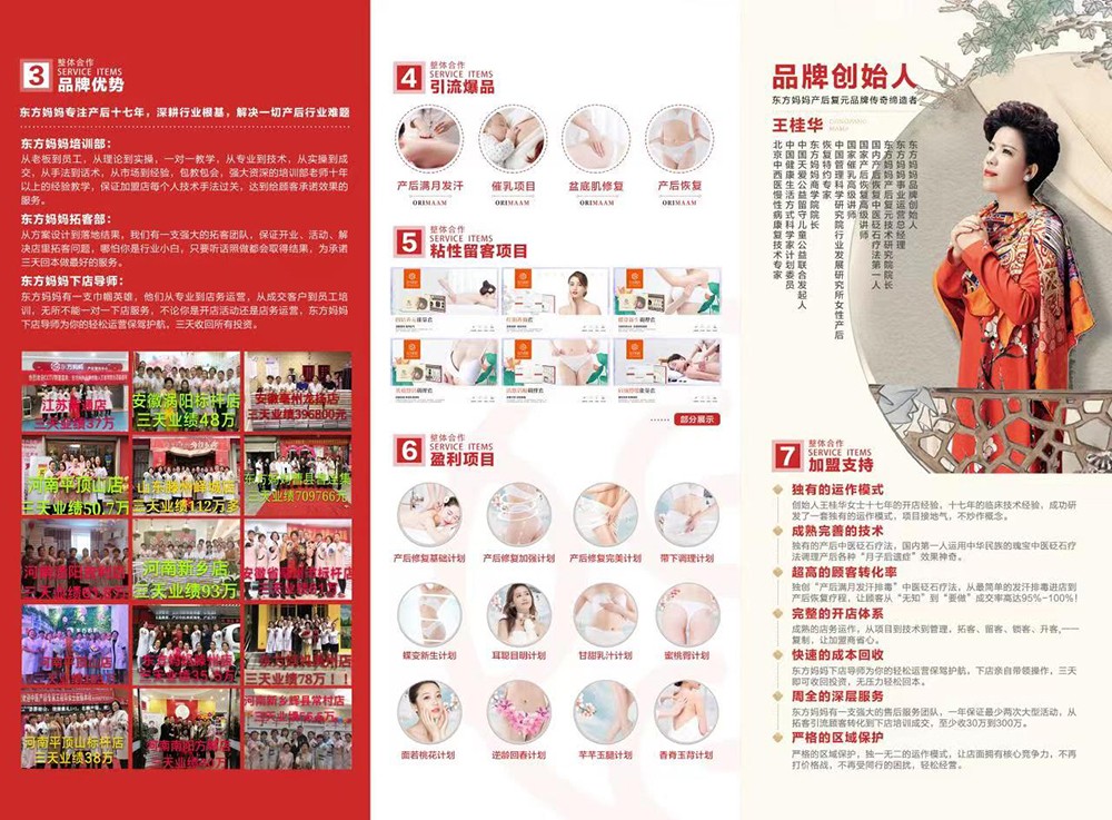 東方媽媽產(chǎn)后復元服務主要包含產(chǎn)后復元、產(chǎn)后體質調理、產(chǎn)后形體恢復、產(chǎn)后美顏修復、產(chǎn)后乳房護理項、以及孕前調理等6大類、近100項特色服務。其中產(chǎn)后滿月發(fā)汗排毒,產(chǎn)后開奶催奶,產(chǎn)后溫腰固腎,產(chǎn)后子宮恢復,產(chǎn)后惡露調理,產(chǎn)后骨盆修復,產(chǎn)后補氣養(yǎng)血,產(chǎn)后十二經(jīng)絡疏通,產(chǎn)后中醫(yī)體質調理等高端服務項目十年時間經(jīng)久不衰,而且東方媽媽因“中醫(yī)產(chǎn)后復元”特有技術,不僅滿月后可以及時消除“月子病”,在生產(chǎn)百天、五六年后、甚至較大年齡客戶的遺留癥狀都可以真正解除病痛困擾。十五年磨一劍,十五年時間已累計徹底解決了近5000萬媽媽的困擾!隨著效果的顯著和認可的人數(shù)越來越多,東方媽媽品牌也不脛而走,很多客戶紛紛前來要求加盟!而東方媽媽除了品牌輸出外,還把技術、銷售與管理等模塊系統(tǒng)化進行通盤輸出,旨在讓加盟商整體導入后,能迅速順利運營。截止目前在中國已有1000多家代理加盟商,遍及山東、北京、江蘇、安徽、山西、河南、河北、陜西、遼寧、吉林、黑龍江、廣西、四川、云南、甘肅、新疆、上海等地區(qū)。