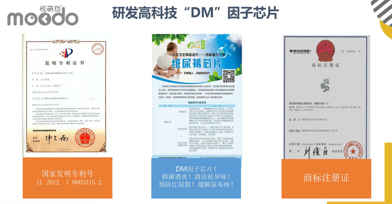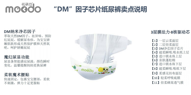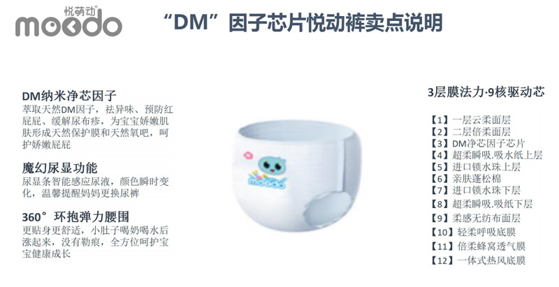 悅萌動品牌,產(chǎn)品涵蓋紙尿褲、悅動褲系列,輕薄防漏,羽柔舒適,DM因子芯體,獨具特色。DM因子(diatom)是一種具有分子篩結(jié)構(gòu)的材料,該種結(jié)構(gòu):具有極強(qiáng)的物理吸附和離子轉(zhuǎn)換性能!能有效的吸附尿尿所產(chǎn)生的異味、能夠預(yù)防紅屁股。