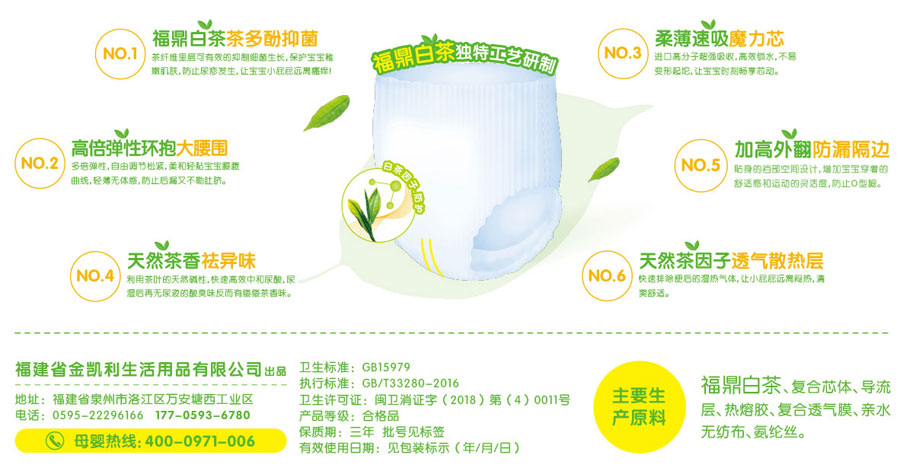 公司利用自身多年的紙尿褲的生產(chǎn)經(jīng)驗和技術(shù)優(yōu)勢,將福鼎白茶成分融入紙尿褲芯體中。福鼎白茶防疹紙尿褲在保持傳統(tǒng)嬰兒紙尿褲產(chǎn)品已有的普通功能外,更有多項新的技術(shù)突破。