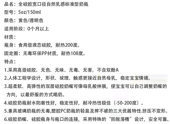 本品采用高級食品級矽膠(Liquid Silicone)制成,無毒、無味、耐高溫120℃可消毒、極好韌性、不易破、更耐用。本品對嬰兒牙床的發(fā)育和牙齦的保護(hù)有特殊效果。能促進(jìn)嬰兒牙齒的正常發(fā)育及臉部肌肉運(yùn)動。