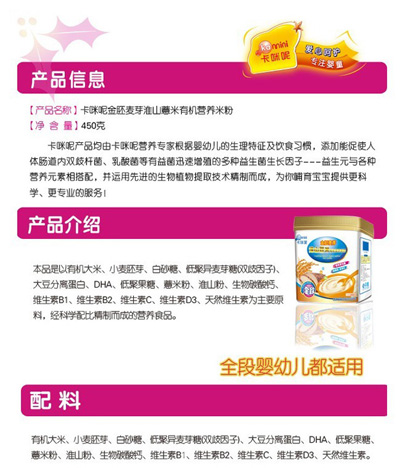 卡咪呢有機(jī)米粉系列是專為中國寶寶設(shè)計(jì)的營養(yǎng)輔食,選用有機(jī)大米,科學(xué)搭配維生素AD等維生素,還特別添加;撬、DHA、AA等有助智力發(fā)育的營養(yǎng)成分,富含15種營養(yǎng)素。現(xiàn)上?ㄟ淠啬笅胗闷酚邢薰久嫦蛉珖瞻资袌鰠^(qū)域誠招卡咪呢有機(jī)米粉代理商。