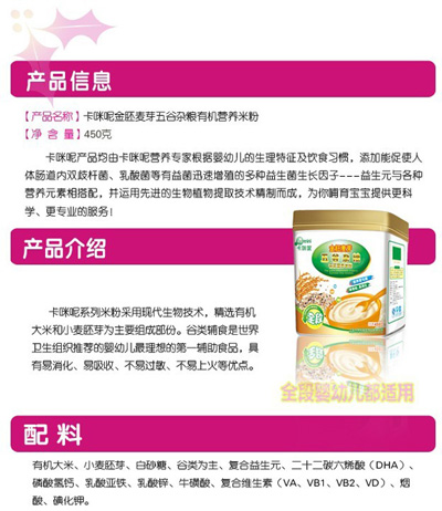 卡咪呢有機(jī)米粉系列是專為中國(guó)寶寶設(shè)計(jì)的營(yíng)養(yǎng)輔食,選用有機(jī)大米,科學(xué)搭配維生素AD等維生素,還特別添加;撬、DHA、AA等有助智力發(fā)育的營(yíng)養(yǎng)成分,富含15種營(yíng)養(yǎng)素,F(xiàn)上?ㄟ淠啬笅胗闷酚邢薰久嫦蛉珖(guó)空白市場(chǎng)區(qū)域誠(chéng)招卡咪呢有機(jī)米粉代理商。