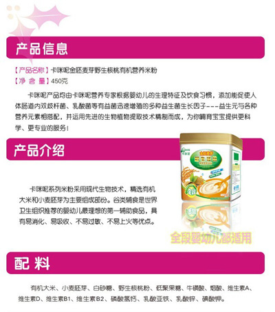 卡咪呢有機米粉系列是專為中國寶寶設(shè)計的營養(yǎng)輔食,選用有機大米,科學搭配維生素AD等維生素,還特別添加牛磺酸、DHA、AA等有助智力發(fā)育的營養(yǎng)成分,富含15種營養(yǎng)素,F(xiàn)上?ㄟ淠啬笅胗闷酚邢薰久嫦蛉珖瞻资袌鰠^(qū)域誠招卡咪呢有機米粉代理商。