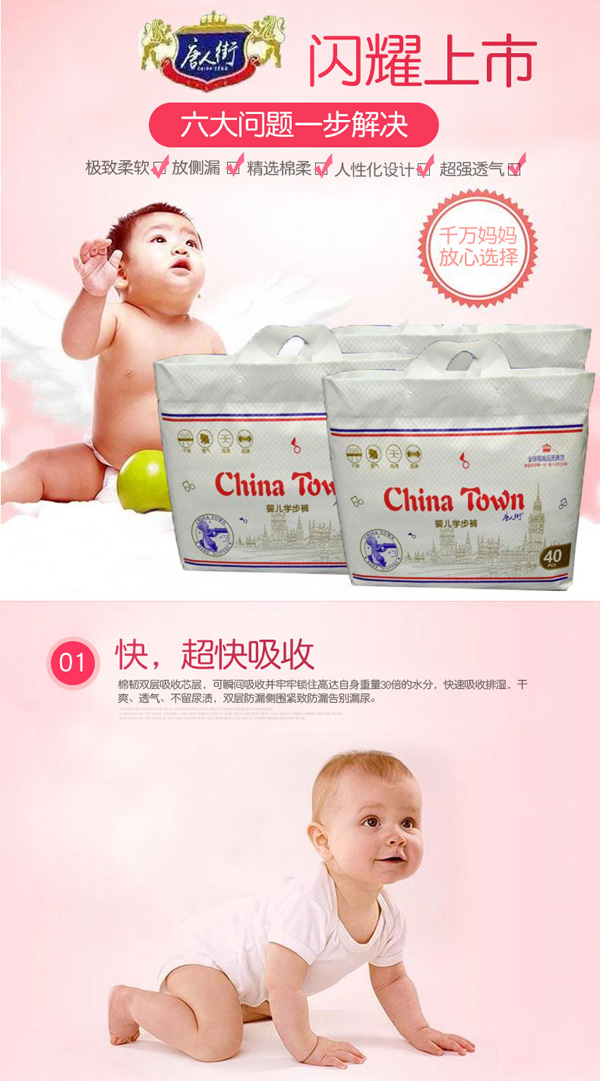 采用全芯體吸收層,不斷裂,不起坨,貼身綿柔,配合科學(xué)化的產(chǎn)品設(shè)計不僅讓尿液吸收速度加快更令吸收量大幅度提升到了800ml。極致熱風(fēng)底膜,超過10000個透氣孔,透氣舒適。親膚透氣底膜,良好的透氣性的PE膜,形成有效的縱向?qū)α骺焖賹?dǎo)出廢氣和濕氣,沒有紅屁屁,讓寶寶的皮膚盡情的呼吸。360°雙層立體防側(cè)漏,寶寶怎么動都不怕。