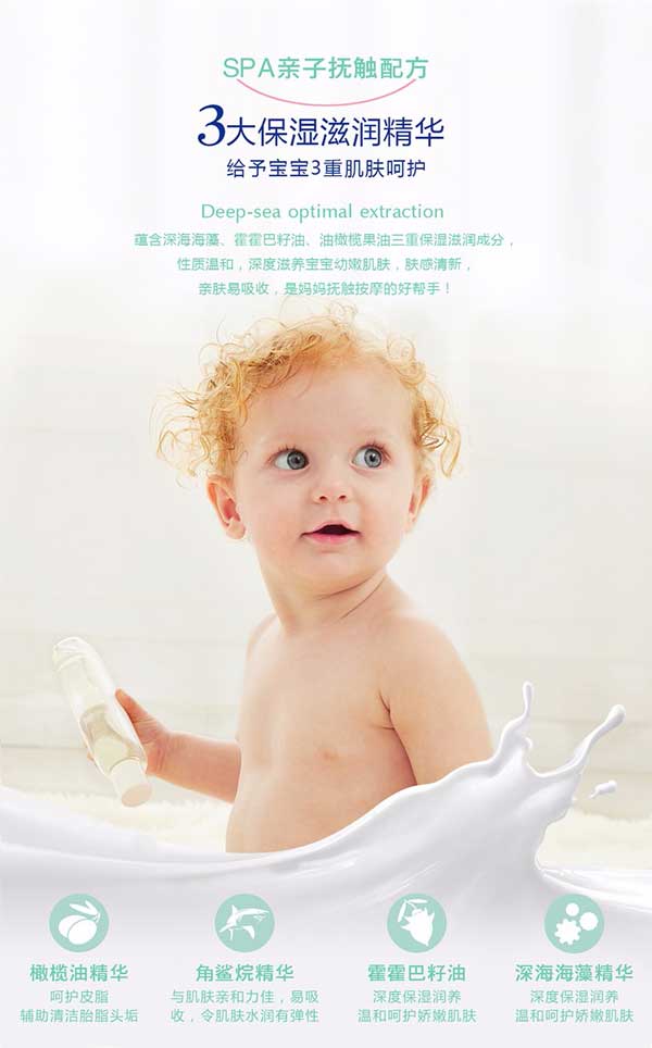貝施康Spa潤膚油是 “深海優(yōu)萃”系列的母愛產(chǎn)品,根據(jù)嬰兒特殊肌膚PH特點研制,從深海中萃取自然純凈成分,配方做到純正安全,讓媽媽心安!
