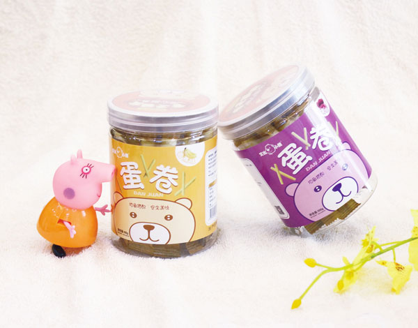 艾比小熊蛋卷系列共包含5種口味,紫薯、椰奶、香蕉、海苔、草莓;精選面粉,含礦物質(zhì)、無機(jī)鹽、蛋白質(zhì),加入雞蛋液、各種果蔬汁、奶汁、海苔碎片等,經(jīng)成糊、成卷、涂抹植物油烤焙而得,蛋卷色澤金黃偏向其中所加