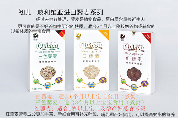 初兒藜麥系列白藜麥、紅藜麥以及三色藜麥三種,由玻利維亞進(jìn)口,品質(zhì)有保障!且已經(jīng)過(guò)去皂苷處理,無(wú)麩質(zhì),安全健康!