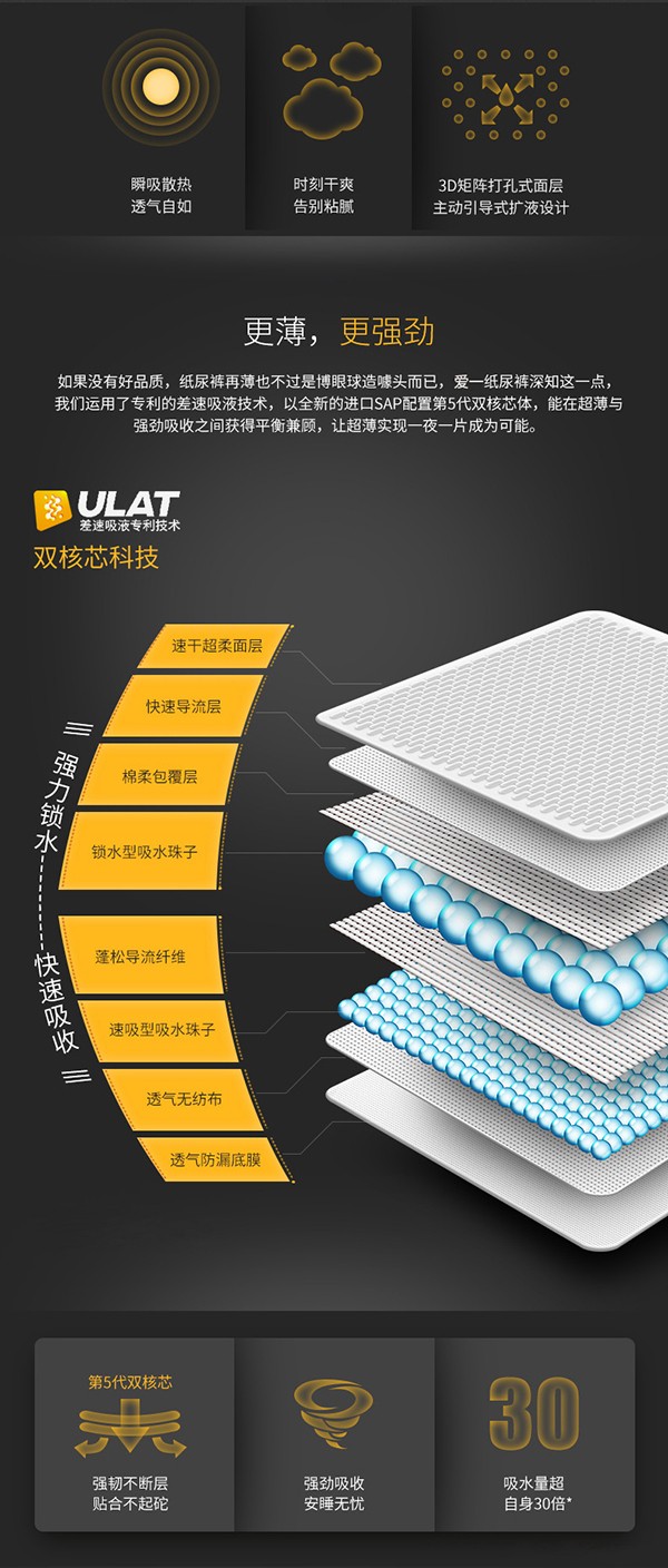 愛一唯愛系列紙尿褲,采用全芯體設計,吸力強勁,滲透性好,輕薄舒適,瞬吸透氣,時刻保持接觸面干爽,給寶寶小屁屁舒適的空降。透氣綿柔底膜,快速排除悶熱濕氣,遠離紅屁屁威脅。