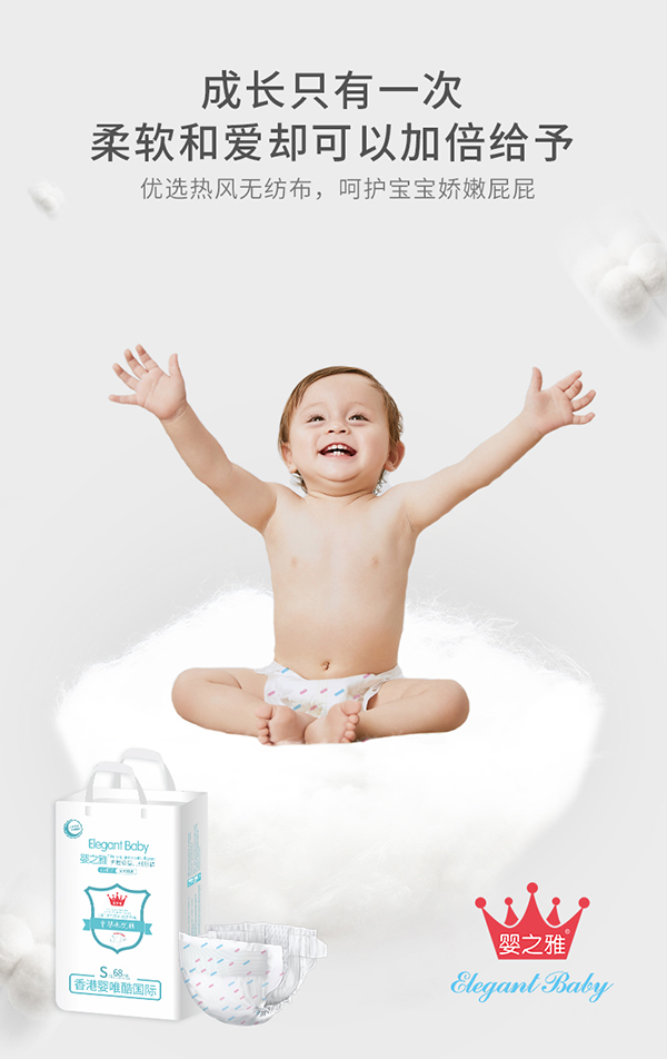 嬰之雅護(hù)理級(jí)嬰兒紙尿褲,優(yōu)選熱風(fēng)無紡布,全熱風(fēng)工藝面層,云柔輕薄設(shè)計(jì),開放柔軟新階段,由內(nèi)向外的棉感,細(xì)心呵護(hù)寶寶每一寸肌膚。高分子吸水芯體,吸力強(qiáng)勁,瞬吸鎖水,快速吸附尿液,并牢牢鎖住,使層面長(zhǎng)時(shí)間保持皮膚干爽,隔離刺激,減少紅屁屁出現(xiàn)的可能性。