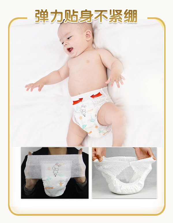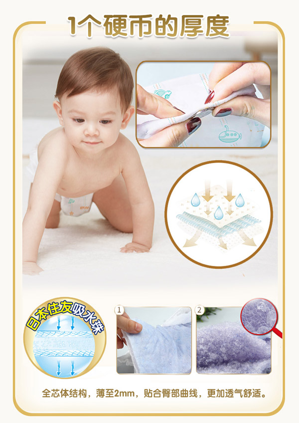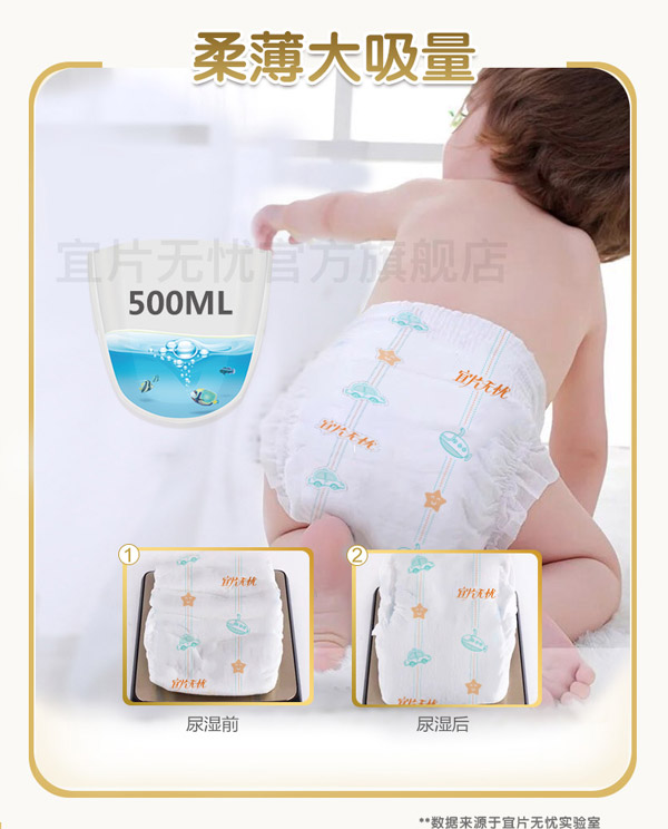 宜片無憂童趣紙尿褲采用熱風材質,親膚柔軟,選用柔軟熱風凸點無紡布作為面料,具有蓬松度高,彈性好,手感柔軟,透氣性好等特點,寶寶穿著舒適,玩的開心,睡得安心。
