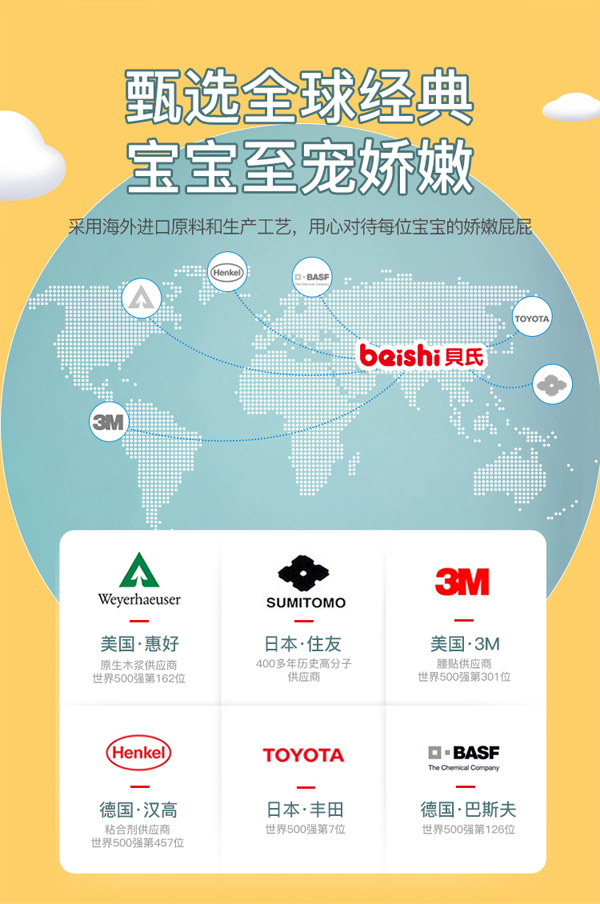采用海外進(jìn)口原料和生產(chǎn)工藝,用心對待每位寶寶的嬌嫩屁屁
