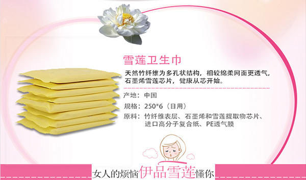 伊品雪蓮衛(wèi)生巾,采用天然竹纖維、石墨烯雪蓮芯、進(jìn)口高分子復(fù)合紙、PE透氣膜等為主要原料,天然竹纖維為多孔狀結(jié)構(gòu),相較綿柔網(wǎng)面更透氣,石墨烯雪蓮芯片,健康從“芯”開始。植物提取,清潔私處,吸水透氣,不含熒光劑,健康更安心。更有超強(qiáng)吸收力,不回滲,沒有異味,擺脫尷尬;粘黏力好,穩(wěn)貼內(nèi)褲補(bǔ)位移。每片均為獨(dú)立包裝,方便更衛(wèi)生,超薄更舒適,有芯更貼心!