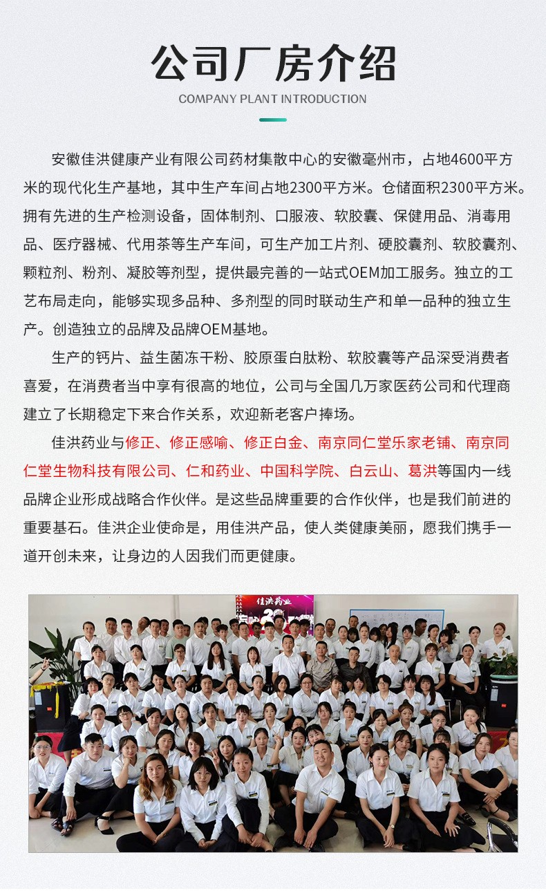 安徽佳洪健康產(chǎn)業(yè)有限公司位于全球最大的中藥材集散中心安徽亳州市,占地4600平方的現(xiàn)代化生產(chǎn)基地,其中生產(chǎn)車間占地2300平。倉儲面積2300平。國際先進的生產(chǎn)檢測設(shè)備,固體制劑、口服液、軟膠囊、保健用品、消毒用品、醫(yī)療器械、代用茶等生產(chǎn)車間,可生產(chǎn)加工片劑、硬膠囊劑、軟膠囊劑、顆粒劑、粉劑、凝膠等劑型,提供最完善的一站式OEM加工服務。獨立的工藝布局走向,能夠?qū)崿F(xiàn)多品種、多劑型的同時聯(lián)動生產(chǎn)和單一品種的獨立生產(chǎn)。創(chuàng)造獨立的品牌及品牌OEM基地。