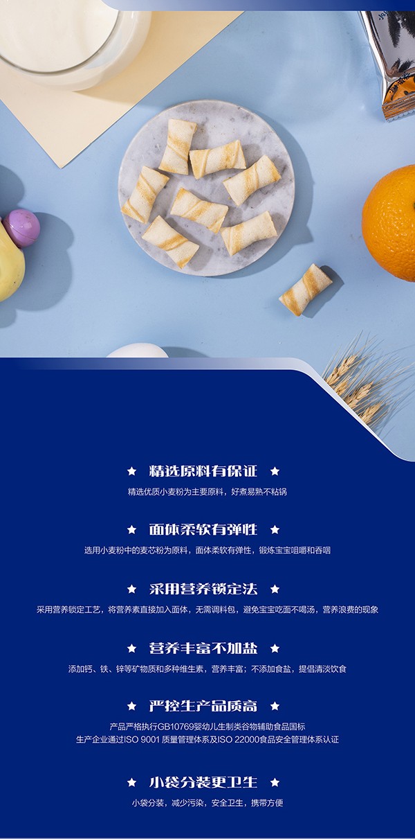 優(yōu)質(zhì)麥粉及新鮮雞蛋;不添加香精、色素、防腐劑。百年工藝,鈣鐵鋅強(qiáng)化,營養(yǎng)更全面。