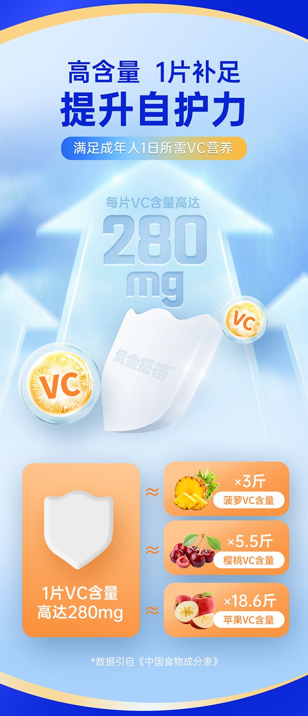 黃金搭檔黃金維生素C含片,藍(lán)帽保健食品,品質(zhì)更放心!根據(jù)成人群體日常VC需求精心研制,守護(hù)健康更給力!每片含維生素C 280mg,滿(mǎn)滿(mǎn)VC,滿(mǎn)滿(mǎn)能量!科學(xué)配比,工藝精湛,營(yíng)養(yǎng)成分更好吸收!純正甜橙口味,酸甜口感,暢享健康!
