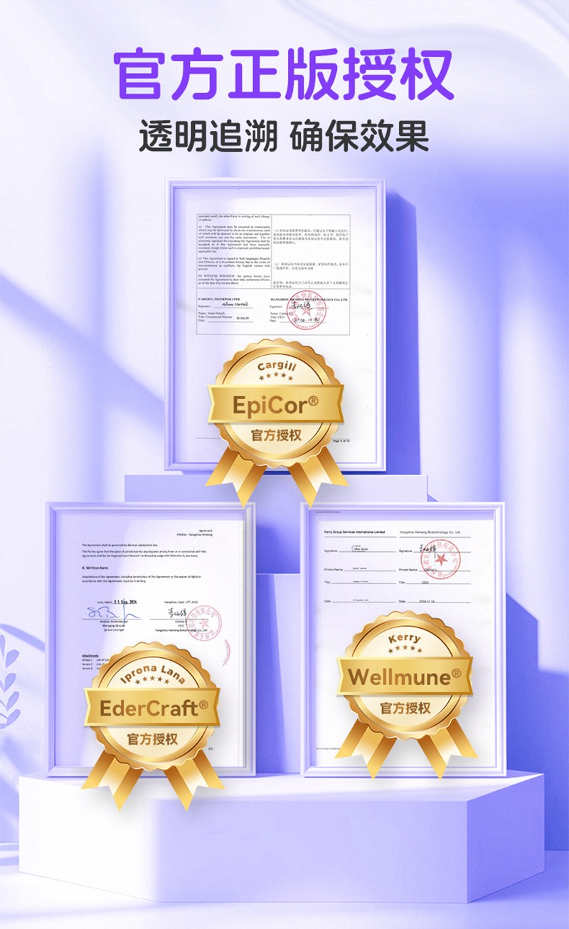 配料表:無水葡萄糖,食用非活性酵母粉(EpiCor®),槐米粉,接骨木莓粉(ElderCraft®),酵母抽提物,酵母B-葡聚糖(Wellmune®),波森