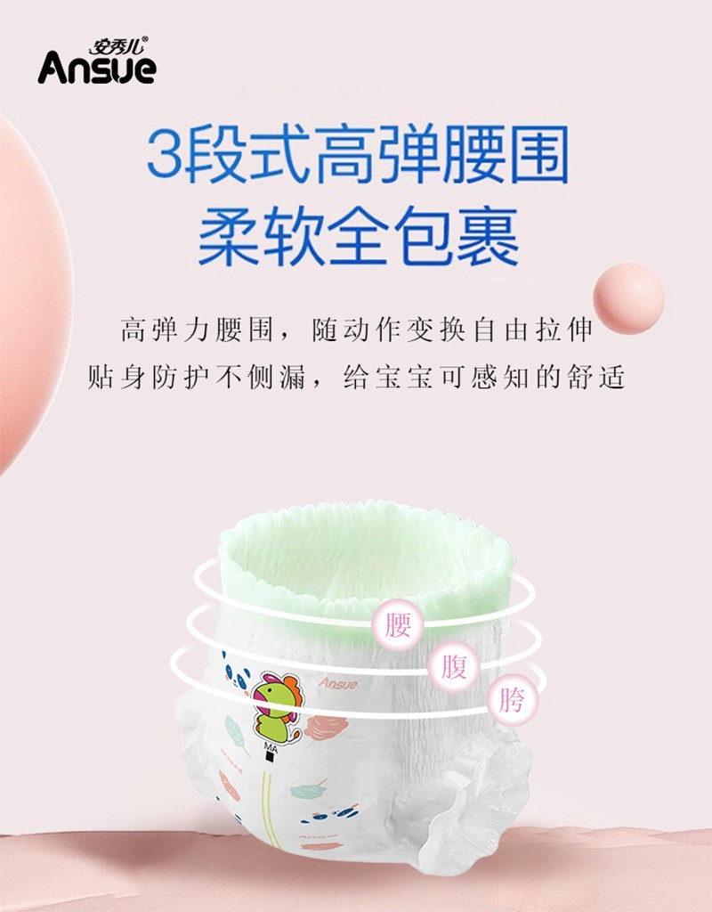 繽紛盛宴嬰兒紙尿褲/拉拉褲,云般柔軟,專為嬰兒肌,多彩設(shè)計(jì)+6代芯體,守護(hù)寶寶每一步。1片瞬吸,8次尿量。瞬吸高分子,一夜一片睡香香;3D表層+智選優(yōu)材,筑牢“屁屁防護(hù)盾”;3D雙層柔點(diǎn)觸感,拒絕潮濕,時(shí)刻干爽親膚;多重品質(zhì)檢驗(yàn),嚴(yán)選優(yōu)材,安全體驗(yàn)有保障;3段式高彈腰圍,柔軟全包裹,隨動(dòng)作變換自由拉伸,貼身防護(hù)不側(cè)漏,給寶寶可感知的舒適;萃取橄欖油精華,呵護(hù)嬌嫩肌,有效防紅臀。搭配科學(xué)護(hù)理提示,換褲清潔、過(guò)敏應(yīng)對(duì)全涵蓋。選安秀兒,給寶寶“臀”級(jí)寵愛(ài)~