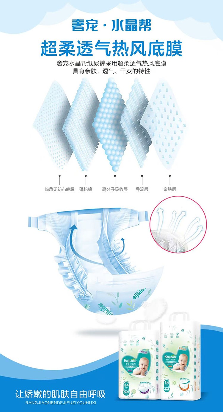 貝嬌兒奢寵水晶幫紙尿褲,采用超柔透氣熱風(fēng)底膜,具有親膚、透氣、干爽的特點(diǎn)。親膚棉柔面層,呵護(hù)嬌嫩肌膚;0.1cm纖薄,輕薄無(wú)負(fù)擔(dān);進(jìn)口高分子,小身材大吸量;約50000個(gè)呼吸微孔,空氣循環(huán)暢通,透氣干爽,遠(yuǎn)離紅屁屁。凸點(diǎn)設(shè)計(jì),減少接觸面,及時(shí)散發(fā)悶熱潮氣。超柔超薄空氣芯,全方位瞬吸導(dǎo)流,拒絕鼓包,拒絕斷層,多次尿量,一片瞬吸,鎖住尿液不回滲,屁屁拒絕潮濕,整晚安睡。