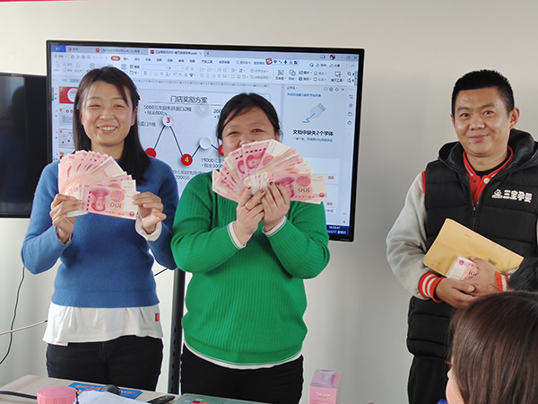 除了新品的講解,“施貝安”品牌針對(duì)線下門店所推出的門店獎(jiǎng)勵(lì)方案亦是誠(chéng)意滿滿,給銷售冠軍們的獎(jiǎng)勵(lì)更是絲毫不含糊!白花花的百元大鈔送到各位銷售精英的手中,看著她們一個(gè)個(gè)洋溢著幸福的笑臉,亦是對(duì)“施貝安”品牌的高度認(rèn)可!