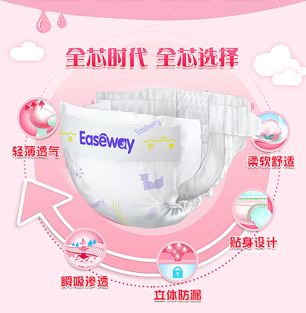 宜氏紙尿褲采用進口高分子薄型吸液芯體,搭配獨特凹槽設(shè)計,實現(xiàn)立體多維吸收,能倍量瞬吸,讓寶寶時刻保持干爽舒適。大吸量的設(shè)計,即使整夜使用也無需擔憂。速滲親柔面層,多維高效吸收,貼體綿彈環(huán)腰,采用科學無束裁剪,不僅穿著舒適,還能全方位貼合寶寶身體。雙層拒水防漏,加上 110mm 加寬芯體,雙倍瞬吸,并且不會斷層、起坨,一片就能使用 10 小時。加寬立體護圍防止側(cè)漏,柔軟立體護圍自動外翻,富有彈性,讓寶寶活動不受限制。