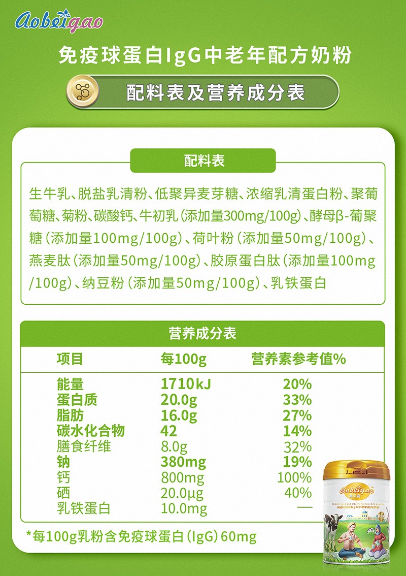 近日,澳貝高品牌正式推出專為中老年人群設(shè)計的免疫球蛋白IgG營養(yǎng)配方奶粉,以生牛乳為主要原料,融合多種天然營養(yǎng)物質(zhì),為中老年群體提供日常營養(yǎng)新選擇。