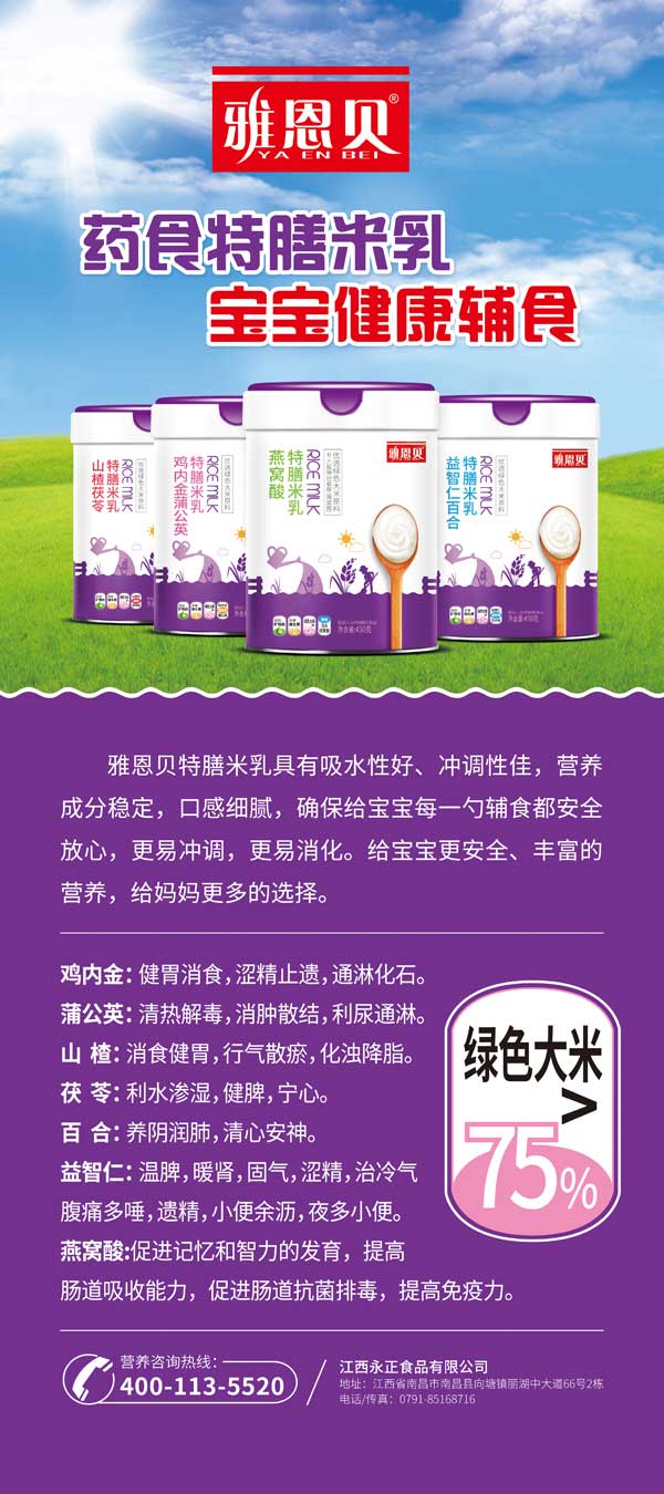 “雅恩貝”是江西永正食品有限公司旗下主打品牌,公司成立于2016年5月26日,是國家制定新政后的新型嬰幼兒輔食企業(yè)。企業(yè)已經(jīng)通過嬰幼兒配方谷粉食品生產(chǎn)許可證(證號(hào):SC10636012111666)和ISO22000食品安全體系認(rèn)證。本著“專業(yè)執(zhí)著,精益求精”的工作原則,秉承“品質(zhì)至上,客戶為本”經(jīng)營理念,研制生產(chǎn)了適合嬰幼兒健康營養(yǎng)需要的米粉類,清火寶類,葡萄糖類等系列產(chǎn)品。