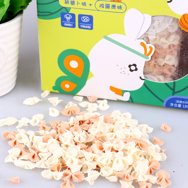 優(yōu)貝兔小蔬菜蝴蝶面精選天然優(yōu)質(zhì)小麥粉為主要原料,科學(xué)配比成長所需的多種營養(yǎng)元素,添加不同的鮮榨果蔬汁,采用獨特的蒸面技術(shù)工藝制作而成,精心設(shè)計成蝴蝶樣式,更能增加食欲,有胡蘿卜味+紫薯味、胡蘿卜味+雞蛋原味、雞蛋原味+菠菜味、雞蛋原味+菠菜味+胡蘿卜味四種不同口味單品,優(yōu)質(zhì)健康,營養(yǎng)豐富,呵護(hù)健康!