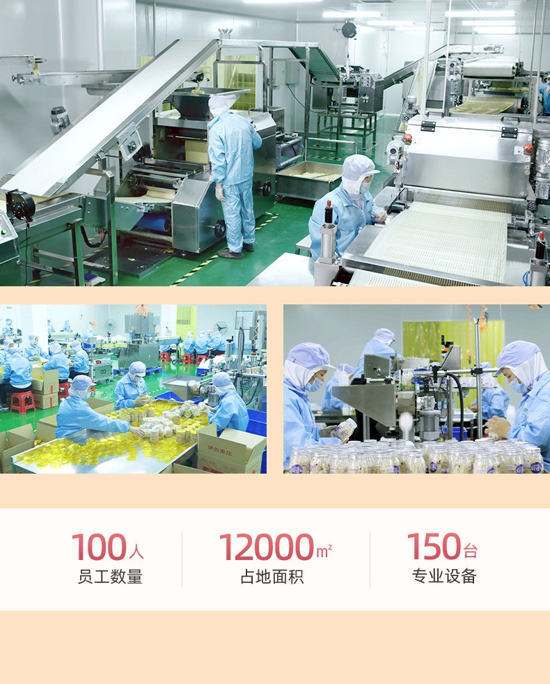 漳州童世界食品有限公司主營(yíng)一站式代加工OEM業(yè)務(wù),致力于健康兒童食品、功能性代餐食品、凍干燕窩的研發(fā)與生產(chǎn),公司占地面積12000平方米,始終秉承已科技為先導(dǎo)、以先進(jìn)的現(xiàn)代化管理依托、已“顧客滿(mǎn)意第一”為宗旨的經(jīng)營(yíng)方針、致力發(fā)展成為一家研發(fā)和制造健康、美味、營(yíng)養(yǎng)的食品企業(yè)。 公司的誠(chéng)信、實(shí)力和產(chǎn)品質(zhì)量獲得業(yè)界的認(rèn)可。歡迎各界朋友蒞臨參觀、指導(dǎo)和業(yè)務(wù)洽談。