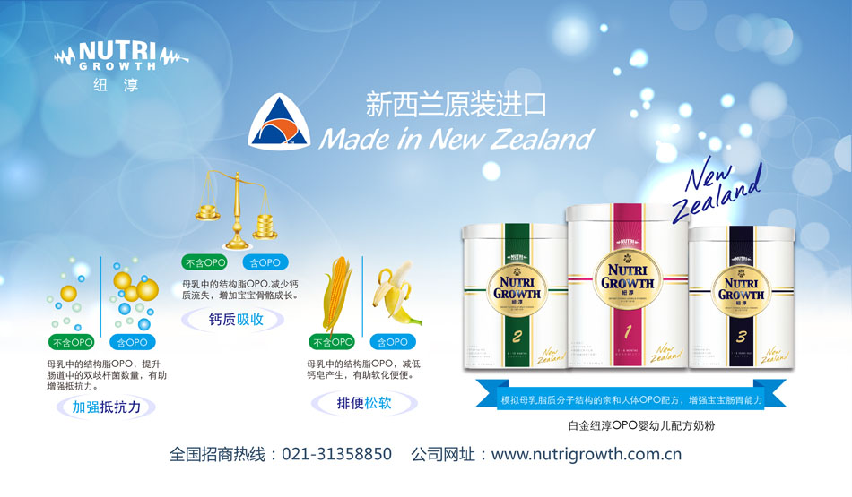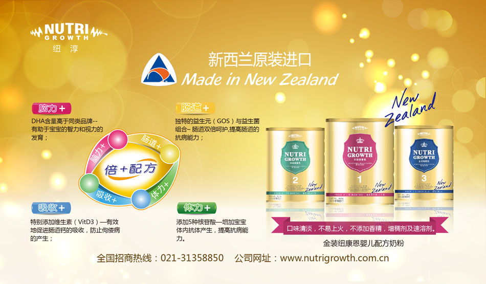 為使中國寶寶也能享受到NUTRI GROWTH NEW ZEALAND LIMITD(紐淳)的關(guān)愛,2008年NUTRI GROWTH 正式進軍中國市場,2009年金裝“紐康恩”嬰幼兒配方奶粉全線上市。