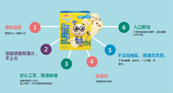 每款口味均首創(chuàng)特別添加了梨清汁,梨汁的清甜與米餅完美融合,保證了米餅口味的天然,不添加糖鹽,健康無(wú)負(fù)擔(dān)。