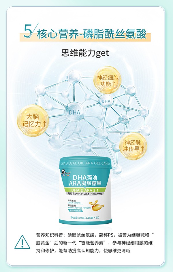 必慧龍DHA藻油 ARA凝膠糖果,嚴(yán)選優(yōu)質(zhì)原料,品質(zhì)放心!DHA+ARA同步,營(yíng)養(yǎng)更均衡!每粒含DHA140mg、ARA70mg,含量更高,配比更科學(xué)!同時(shí)添加葉黃素酯、磷脂酰絲氨酸、核桃肽粉等等,嚴(yán)格工藝制作,營(yíng)養(yǎng)好吸收,口感更純正,貼心護(hù)成長(zhǎng)!