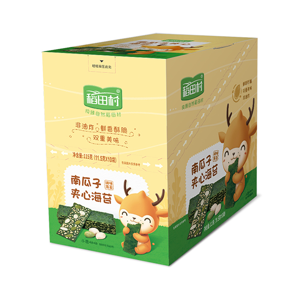 稻田村夾心海苔,鮮香酥脆,雙重美味。不加食品添加劑;不加醬油、不加味精;不加食用油,烘焙非油炸;選用品質紫菜,色澤自然墨綠,片薄均勻,鮮嫩有光澤,有紫菜本身的清香;科學搭配紫菜與酥脆夾心的比例,甜度適中,口感鮮香。