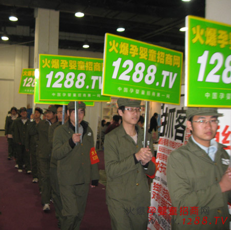 我們火爆孕嬰童穿上我們標(biāo)志性服裝,身穿紅衛(wèi)兵綠色軍裝,頭戴火爆字樣綠色軍帽,左臂佩戴紅色火爆字樣袖章,高舉火爆孕嬰童招商網(wǎng),1288.tv字樣的宣傳牌吸引了所有參展人員的目光。